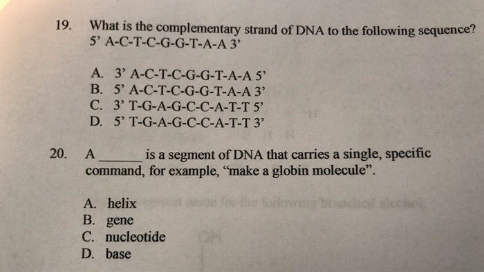 The DNA encoding strand which is complementary to the pattern wire is 5 ATGGCAACCCAGGTAGTTTG 3 c. A only ever pairs with T and C only ever pairs with G. Related questions 0 votes.