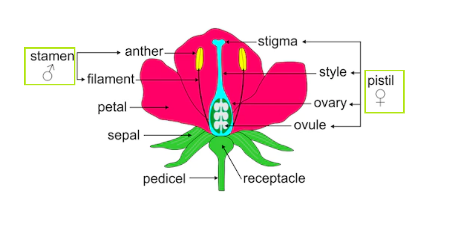 The pistil contains the stigma style and ovary. Male and Female reproductive parts of a flower. Correct answer to the question.